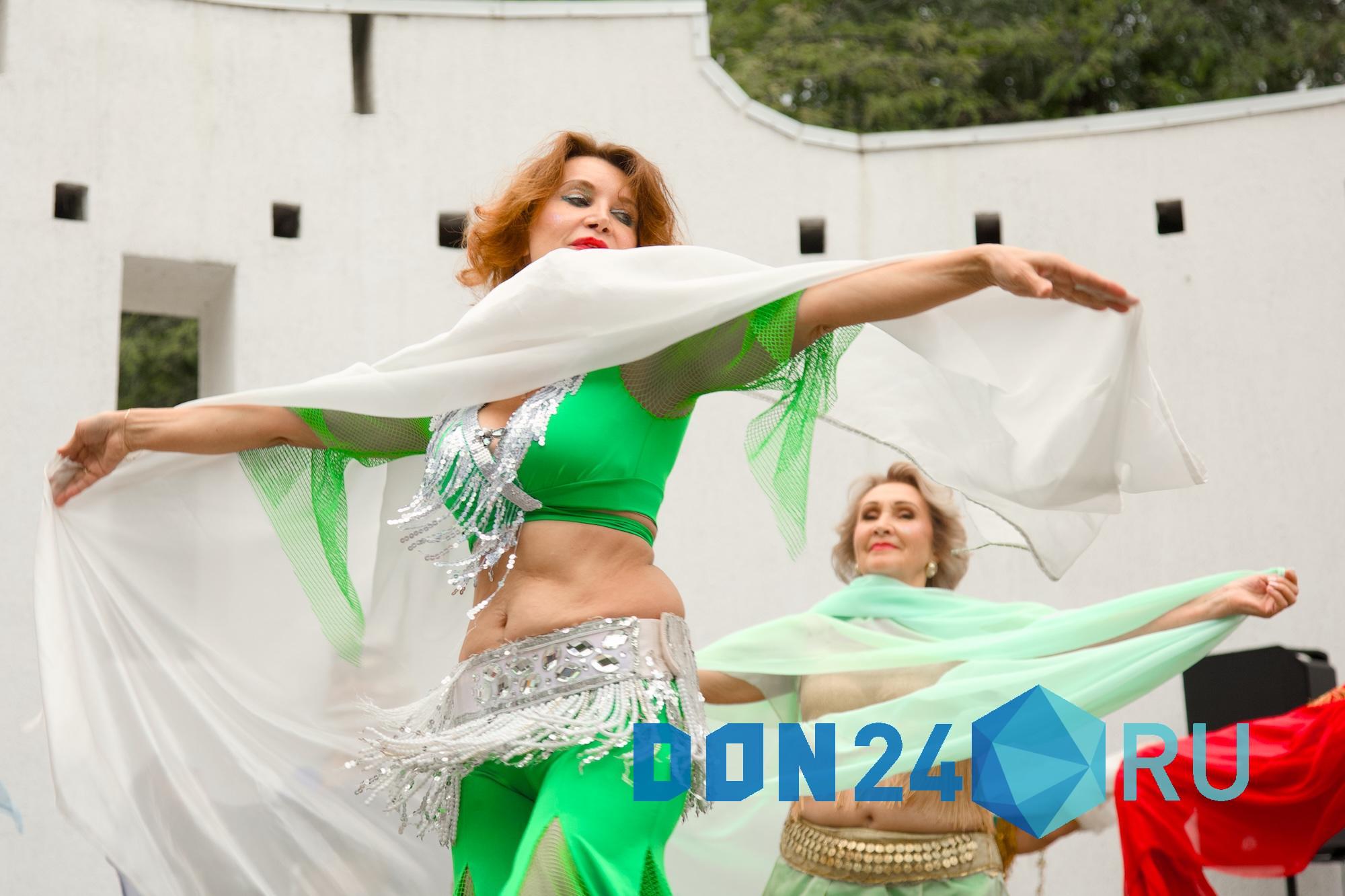 Несмотря на пасмурный вечер и температуру около 10 °C, дамы за шестьдесят оголили свои животы и продемонстрировали умение владеть телом в ритме восточного танца.