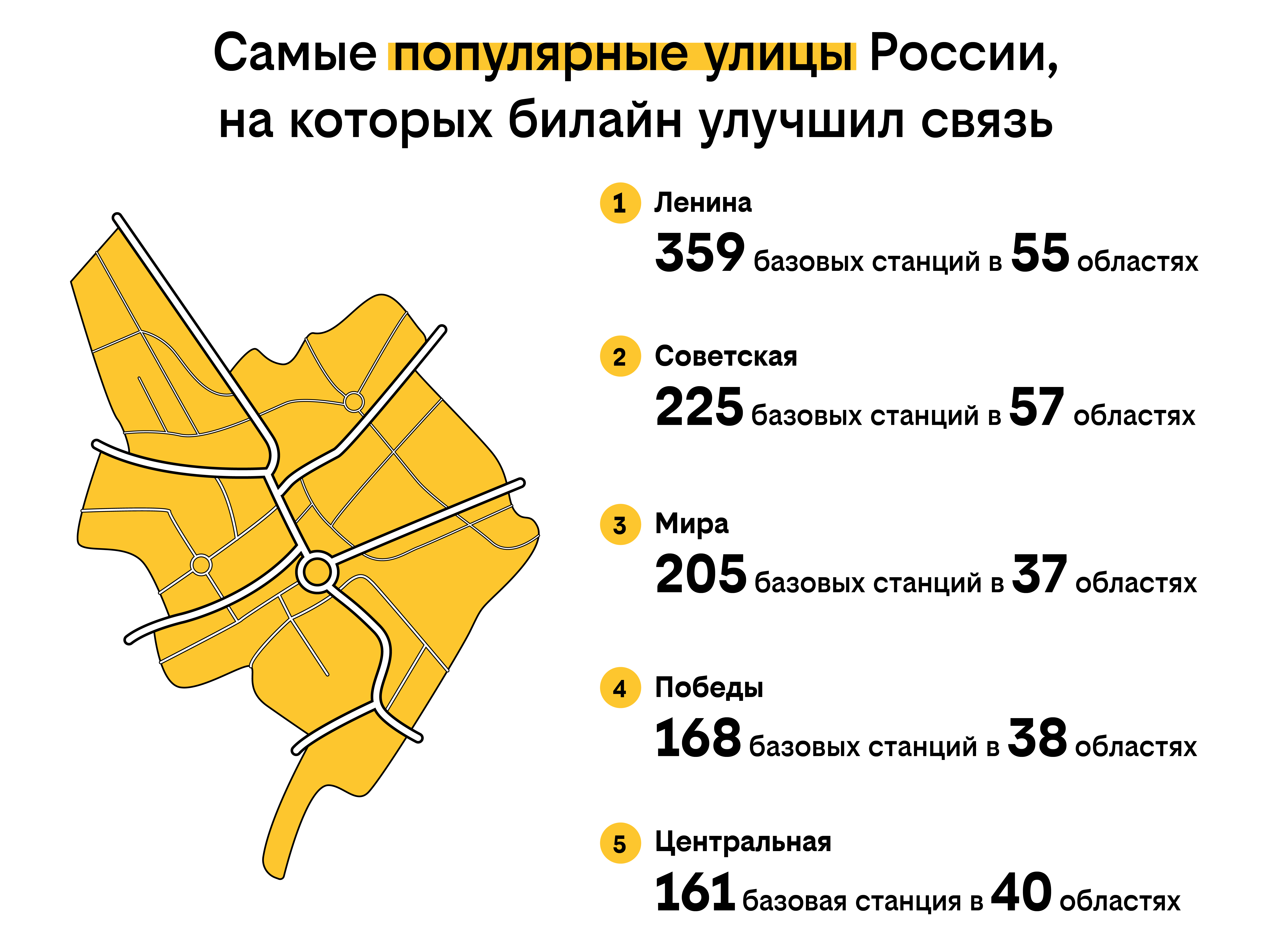 Говоря о топонимах, общих для многих городов страны, в компании отметили несколько сотен улиц Ленина, где в прошлом году построены базовые станции билайна.