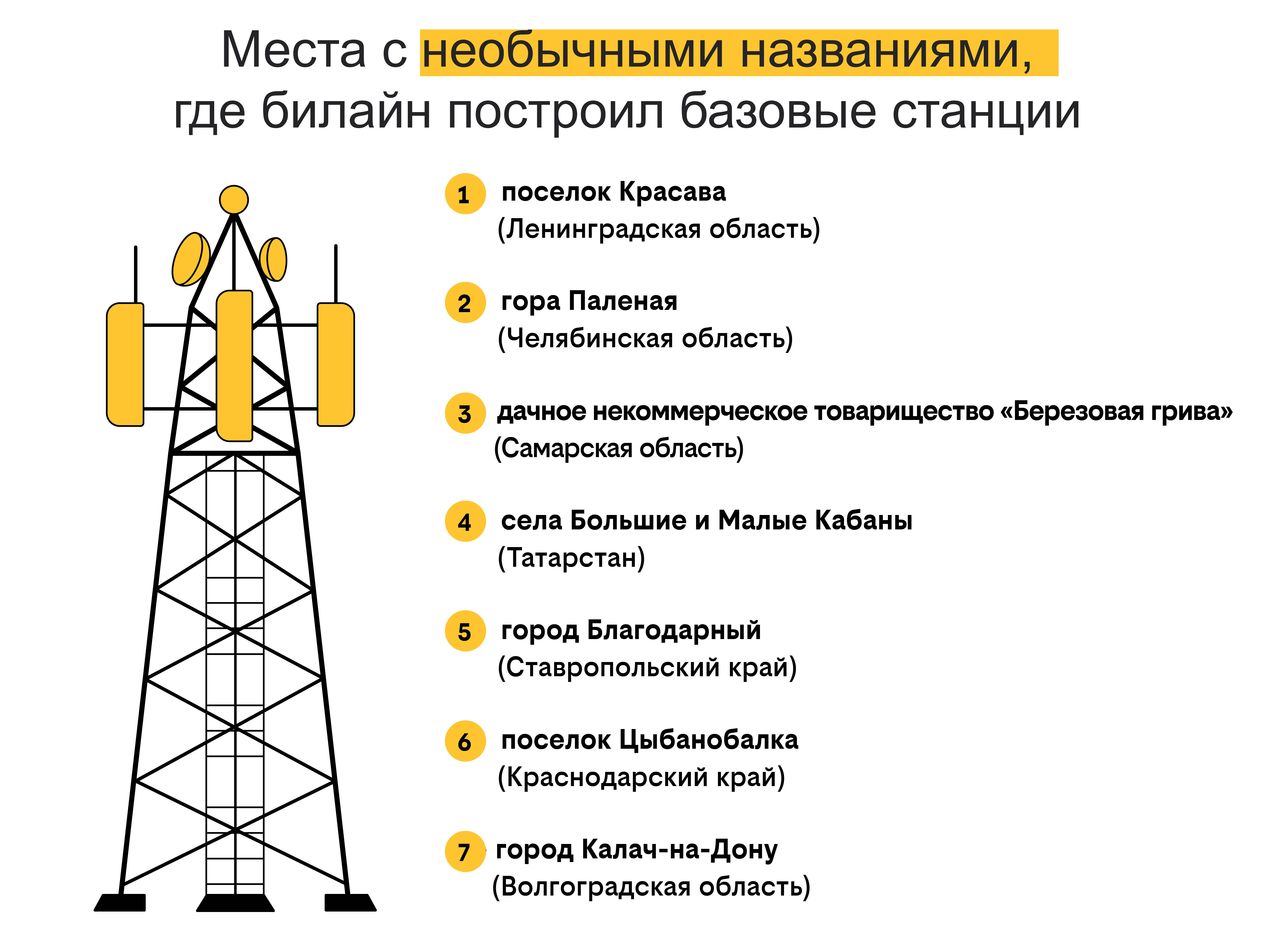 Стройка сети билайна проходила и в городах-миллионниках, и в деревнях. Вот тут и открывается все многообразие названий. Например, новые базовые станции появились в селах Колбаса и Старый Карапуз в Новосибирской области.