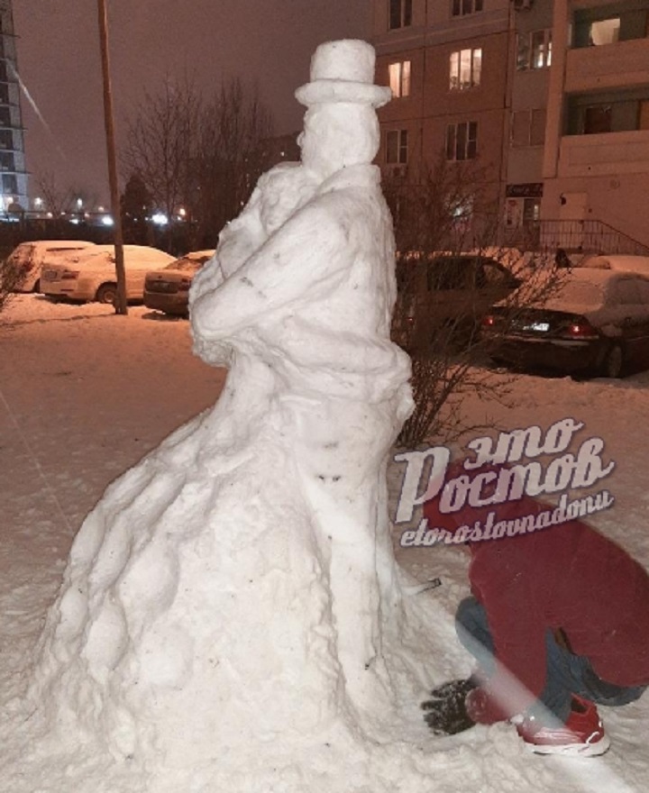 Житель Левенцовки слепил из снега влюбленную пару, чем вызвал восторг местных жителей. Под выложенным в сеть снимком они написали: «Спасибо скульптору Сергею, который каждый год радует ростовчан своими снеговиками».