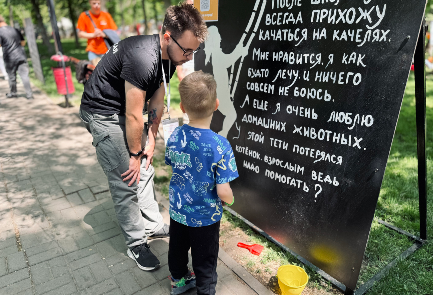 Помимо инсталляции, вдоль прогулочной зоны неподалеку от знаменитого колеса обозрения волонтеры разместили информационные стенды с собирательными историями о пропаже ребят. Один и тот же случай рассказан от лица взрослого и ребенка.