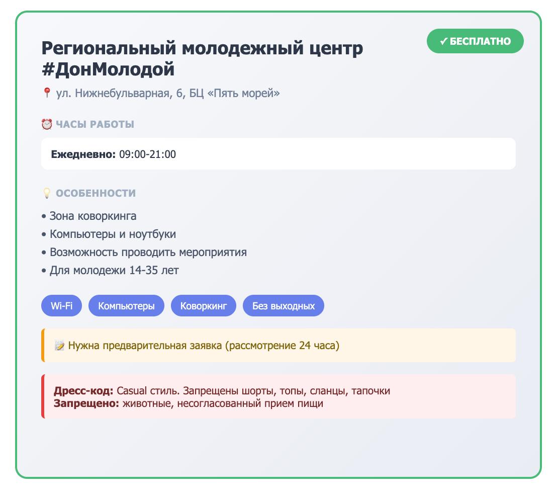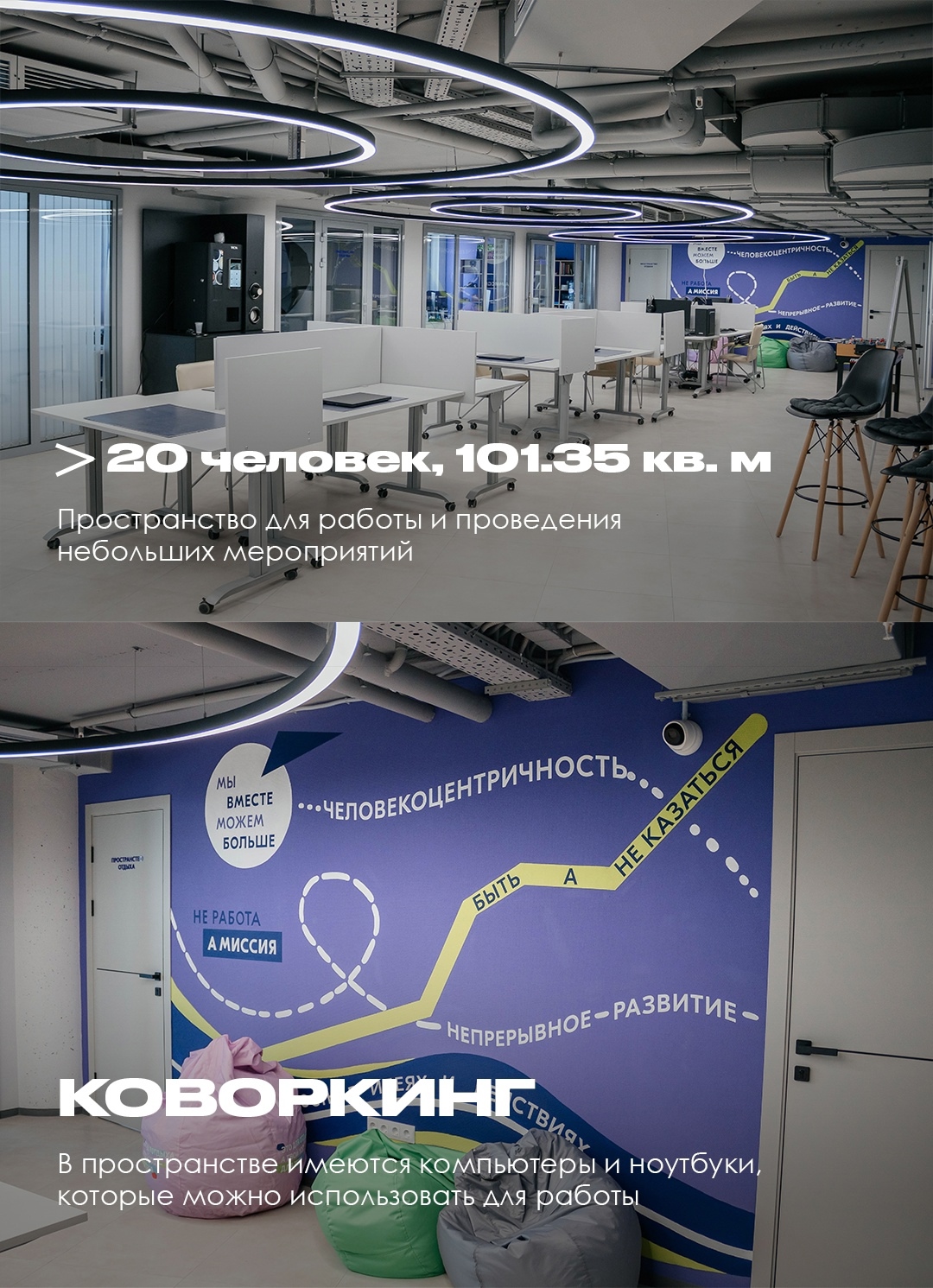 Центр – точка притяжения молодежи, позволяющая всем желающим проводить тематические мероприятия, предполагает также зону коворкинга, оборудованную компьютерами и ноутбуками. Для записи обязательно ознакомьтесь с правилами и подайте заявку, заполнив форму по ссылке. Ее рассмотрят в течение 24 часов после отправления, при внесении изменений обработка может занять еще один-два дня. В случае отмены брони об этом следует сообщить администратору.