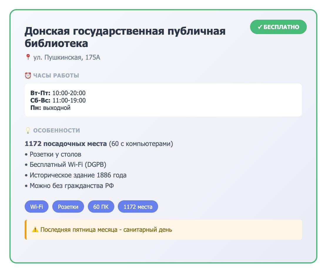 Старейшее книгохранилище Юга России, основанное 7 января 1886 года – одна из самых ярких достопримечательностей Ростова, многие горожане назвали бы ее обязательной к посещению. Помимо завораживающего интерьера с обилием зелени и фонтаном, здание оборудовано 60 посадочными местами с компьютерами, всего посадочных мест в библиотеке 1172. Сюда можно прийти со своим ноутбуком, большинство читательских столов оборудованы розетками. Здесь есть и бесплатный Wi-Fi – после выбора сети DGPB авторизация проходит по номеру телефона. Стать читателем библиотеки можно, даже не имея российского гражданства.