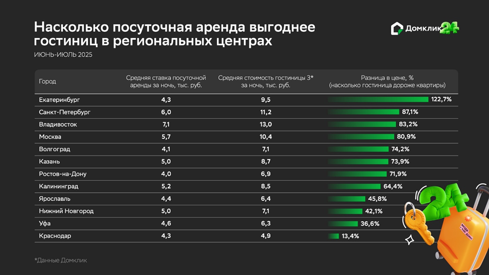 Крупные и курортные города России предлагают широкий выбор вариантов размещения — от гостиниц и хостелов до частных домовладений и палаточных лагерей. Аналитики Домклик выяснили, что аренда частного жилья дешевле проживания в гостинице в среднем на 60%. По статистике, в летний период средняя стоимость посуточной аренды квартиры составляет 5,3 тыс. руб., тогда как номера в гостинице или трехзвездочном отеле – 8,5 тыс. рублей.