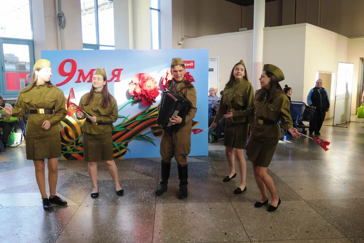 В вагонах и на станциях звучали песни «Маруся», «Как за Доном за рекой», «Катюша», «Казаки» и другие. Молодой баянист и четыре девушки в гимнастерках напомнили песнями о тех, кто воевал, кто погиб и кто остался жив.