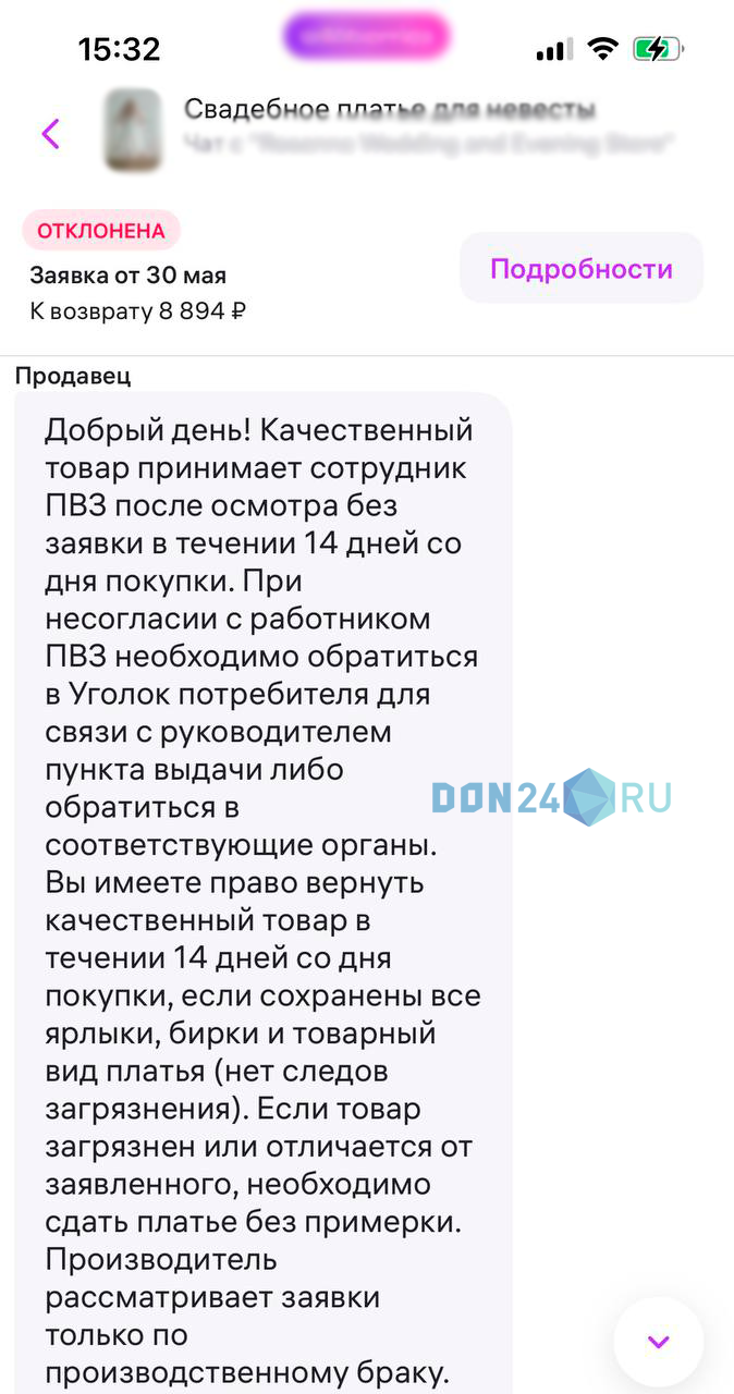 Но так не получилось. Поддержка и продавец маркетплейса не одобрили заявку на возврат. Марина попыталась подать апелляцию, но ее тоже отклонили. Продавец посоветовал или самостоятельно отстирать платье, или написать жалобу на сотрудницу ПВЗ в Роспотребнадзор, если она не принимает платье.