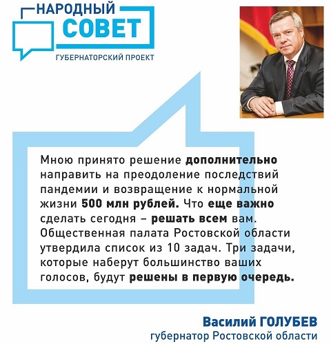 Добавим, инициатором такого голосования стал донской губернатор Василий Голубев. С 25 июня по 1 июля включительно жители области самостоятельно выбирают варианты расходования 500 млн бюджетных средств. Сделать это можно на участках для голосования по поправкам к Конституции РФ, а также на специальном сайте sovet.donland.ru.