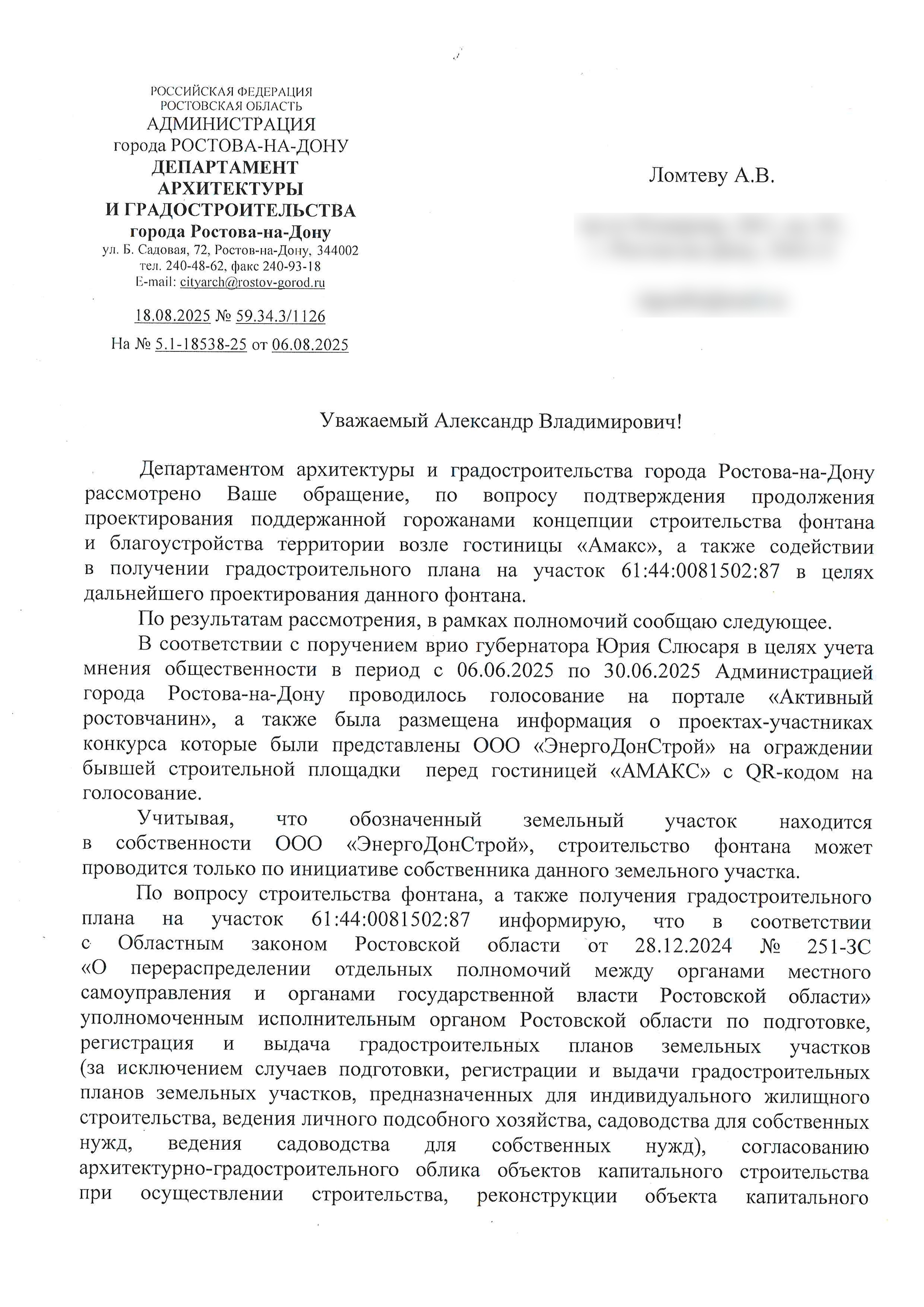 Из прикрепленных к посту ответов департамента архитектуры и градостроительства Ростова следует, что земельный участок находится в собственности ООО «ЭнергоДонСтрой».