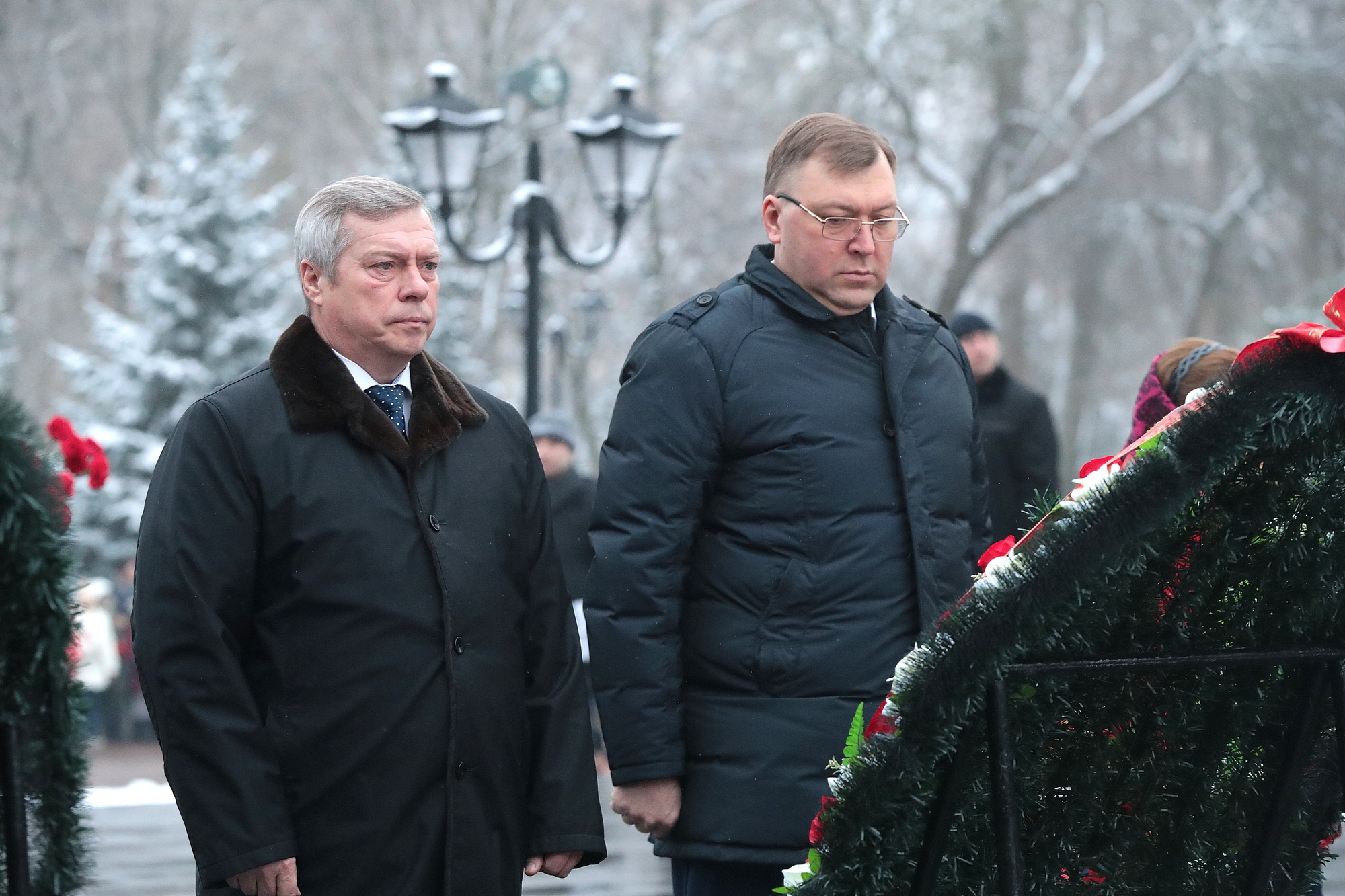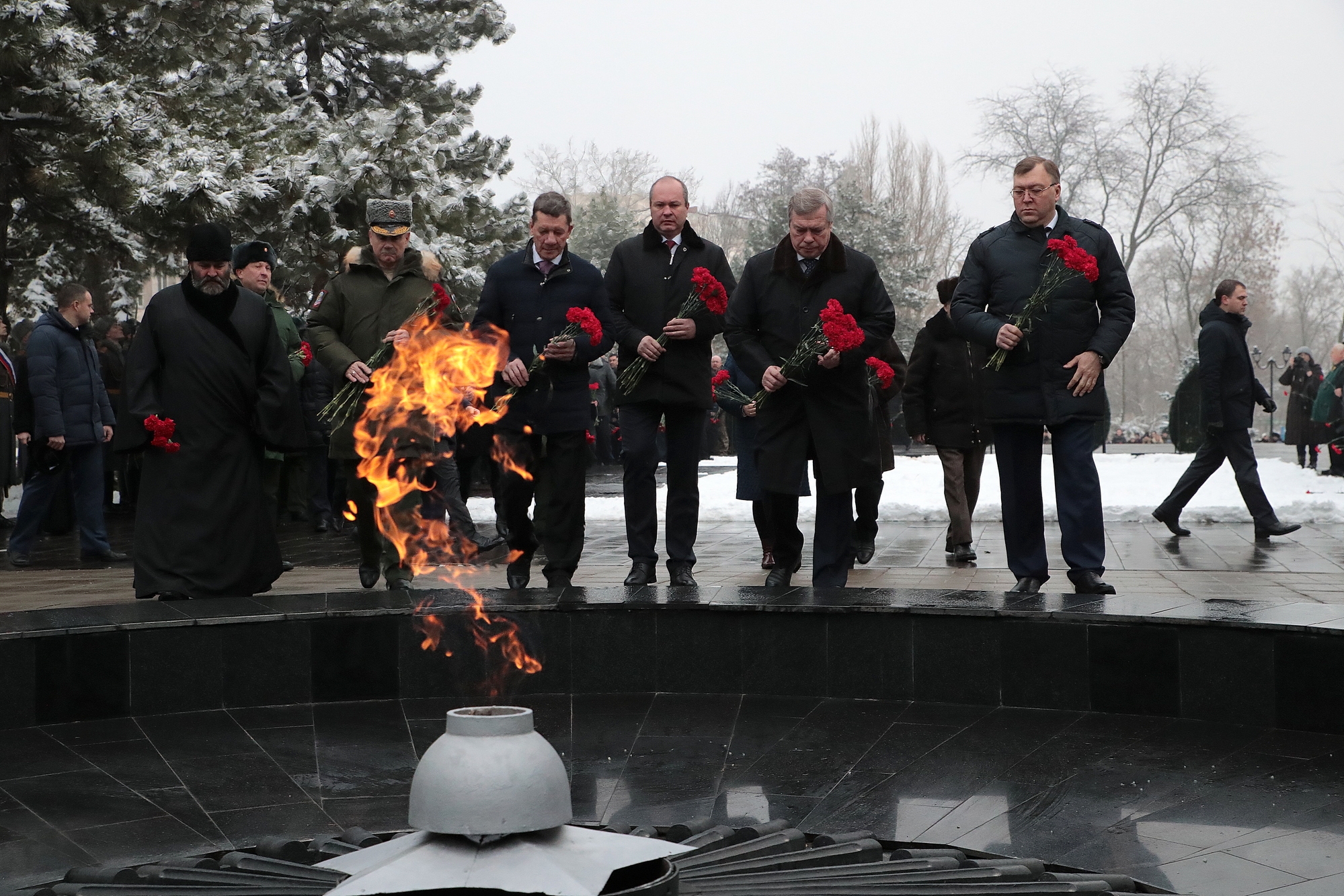 Ростов-на-Дону, 14 февраля 2018. DON24.RU. Ростовчане у мемориала в парке имени Фрунзе почтили минутой молчания память павших воинов Великой Отечественной войны. К Вечному огню были возложены цветы. В этот день 75 лет назад Ростов был во второй раз освобожден от немецко-фашистских захватчиков. В торжественной церемонии приняли участие губернатор Василий Голубев, представители Законодательного Собрания области и Южного военного округа, градоначальник Виталий Кушнарев, ветераны, курсанты и школьники.