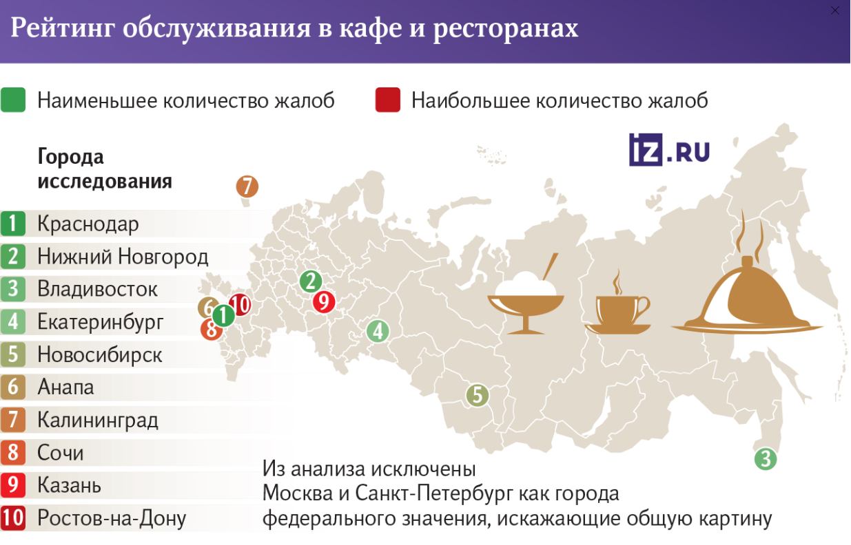 В донской столице посетители чаще всего жаловались, что их обсчитали. Соседний Краснодар, занявший первую строчку рейтинга, оказался при этом на последнем месте по «вежливости и коммуникации официантов».