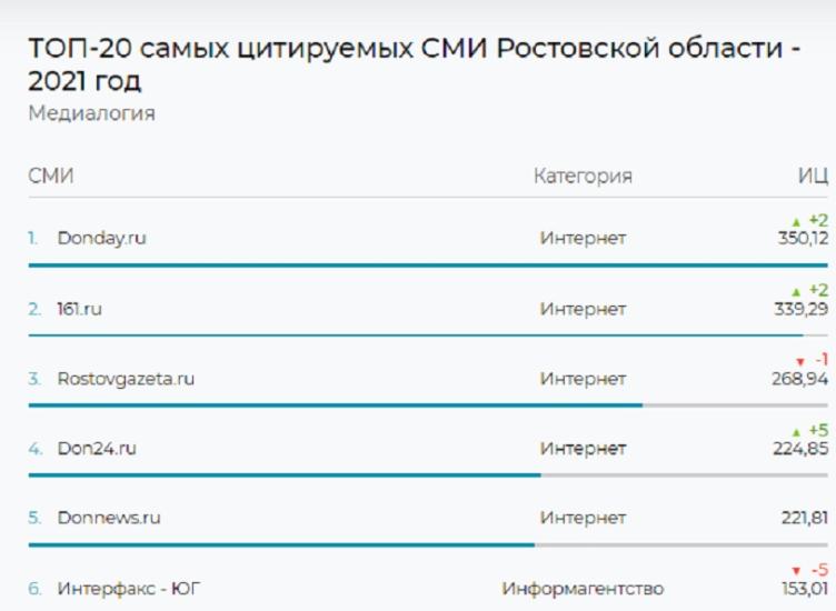 Также в топ-20 самых цитируемых СМИ региона вошло еще одно подразделение холдинга «Дон-медиа» – телеканал «ДОН 24». С индексом 62,64 он находится на 11-м месте.