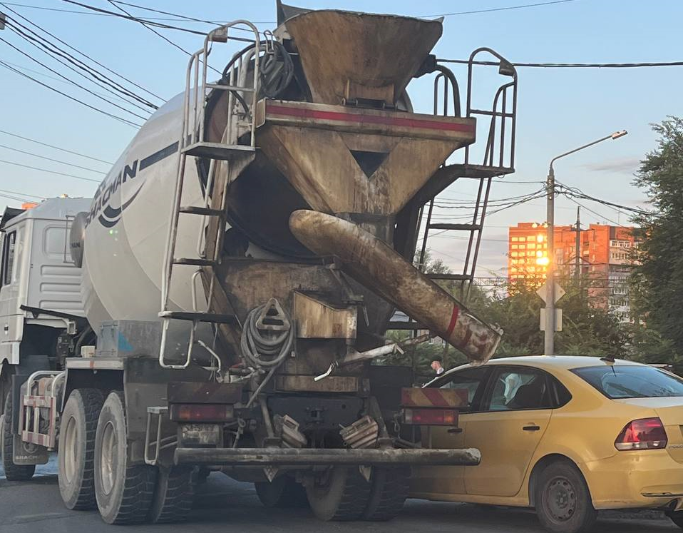 Не разъехались строительный спецтранспорт с бетономешалкой и легковушка.