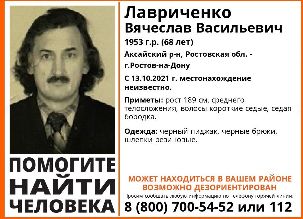 Ростовская область, 18 октября 2021. DON24.RU. В Аксайском районе без вести пропал 68-летний Вячеслав Лавриченко. Об этом сообщили в поисковом объединении «Лиза Алерт Юг».