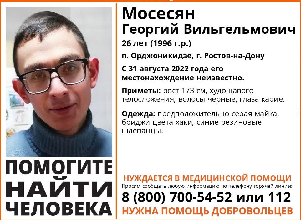 Ростовская область, 1 сентября 2022. DON24.RU. В ростовском поселке Орджоникидзе пропал 26-летний Георгий Мосесян. Об этом сообщили в поисковом объединении «Лиза Алерт Юг».