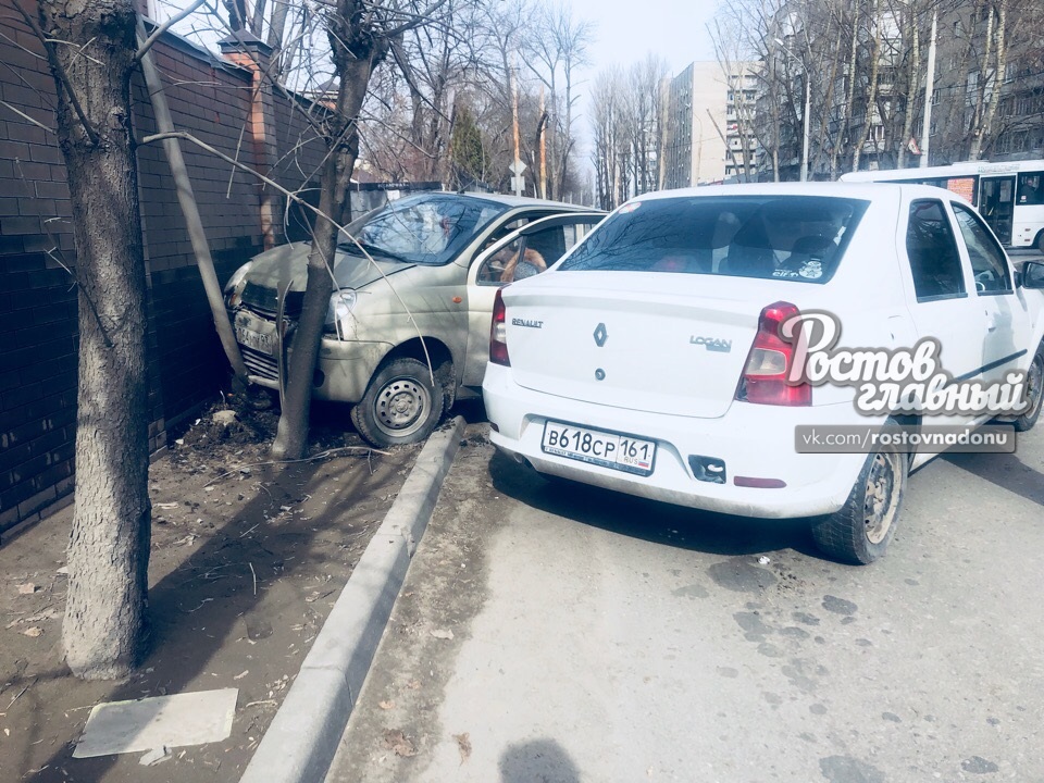 Ростов-на-Дону, 6 марта 2019. DON24.RU. Две легковушки не поделили дорогу в Ростове. Авария произошла сегодня днем в Первомайском районе. Как сообщают в соцсети очевидцы, на пересечении улиц Туполева и Днепропетровской стокнулись Daewoo Matiz и Renault Logan. Пытаясь уйти от удара Matiz не справился с управлением и врезался в забор жилого дома.