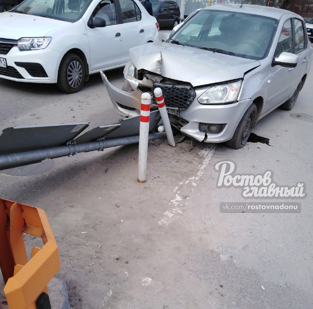 Ростов-на-Дону, 22 марта 2019. DON24.RU. Дорожно-транспортное происшествие произошло сегодня днем на Привокзальной площади Ростова. Водитель Datsun не справился с управлением и снес дорожный знак. Фотографии последствий ДТП выложили в Сеть очевидцы.