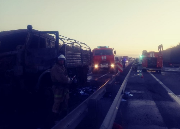 Как сообщает канал, военный КамАЗ врезался в фуру и загорелся после столкновения.