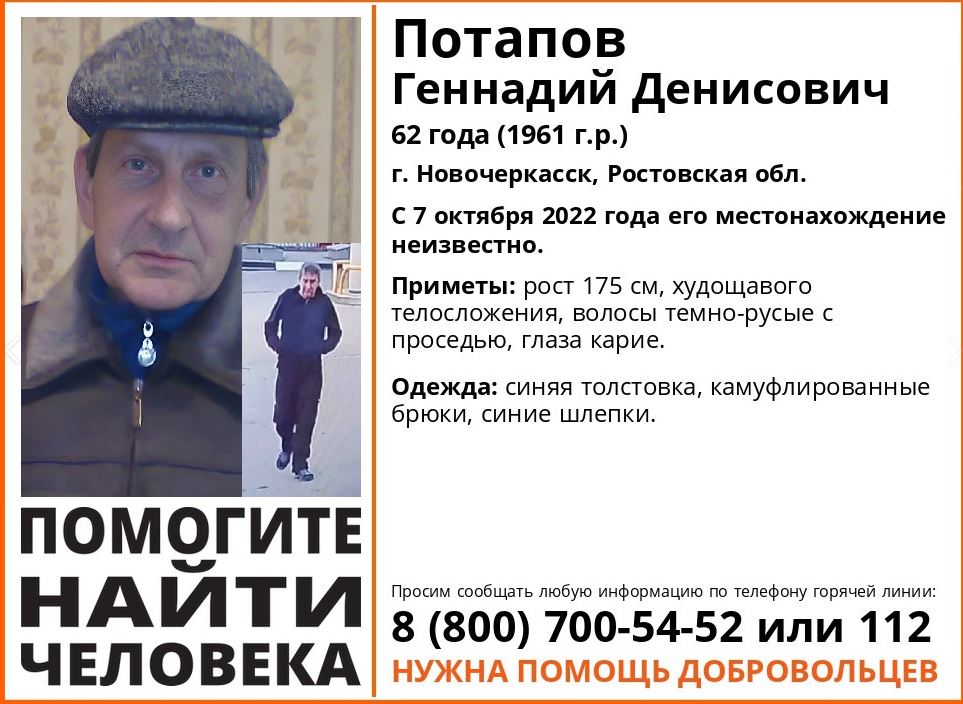Ростовская область, 24 октября 2022. DON24.RU. В Новочеркасске уже две недели ищут пропавшего без вести 62-летнего Геннадия Потапова. Об этом сообщили в поисковом объединении «ЛизаАлерт».