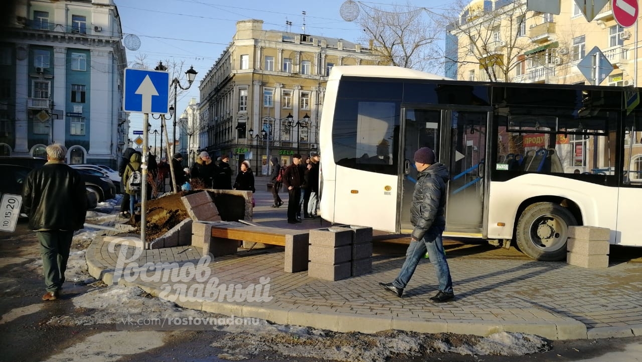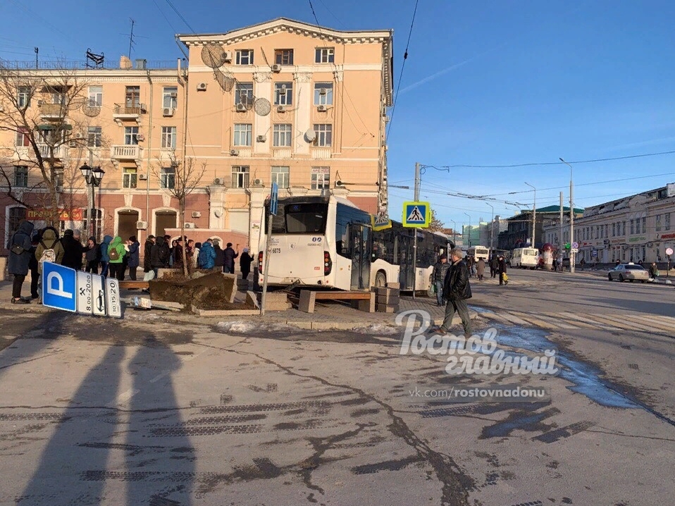 Ростов-на-Дону, 21 января 2019. DON24.RU. Курьезное ДТП произошло накануне днем в Ростове на остановке «Центральный рынок». По словам очевидцев, автобус № 78 выкатился на тротуар, где снес дорожный знак и разбил цветочную кадку. В момент происшествия водителя в автобусе не было.