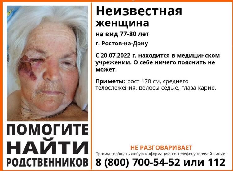 Ростовская область, 27 июля 2022. DON24.RU. Волонтеры просят помощи в установлении личности неизвестной женщины, которая попала в ростовскую больницу. Как сообщили в поисковом объединении «Лиза Алерт Юг», о себе ничего пояснить она не может.