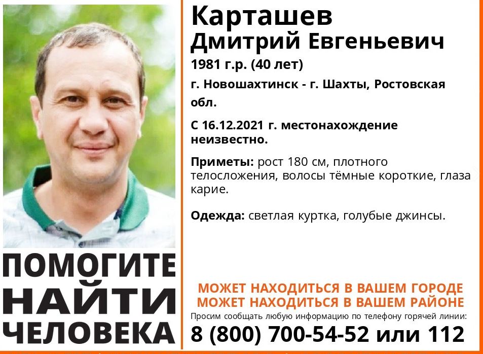 Ростовская область, 20 декабря 2021. DON24.RU. В Ростовской области разыскивают пропавшего без вести 40-летнего Дмитрия Карташева. Об этом сообщили в поисковом объединении «Лиза Алерт Юг».