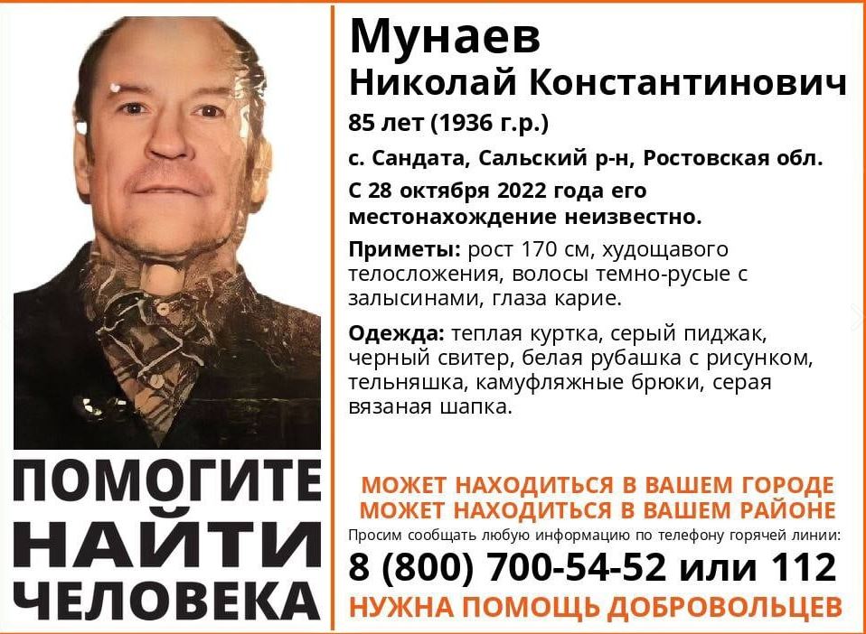 Ростовская область, 3 ноября 2022. DON24.RU. В селе Сандата Сальского района без вести пропал 85-летний Николай Мунаев. Его местонахождение неизвестно с 28 октября, сообщили в поисковом объединении «ЛизаАлерт».