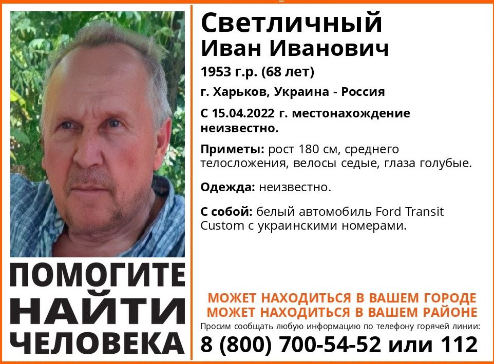 Ростовская область, 14 июня 2022. DON24.RU. В Ростовской области разыскивают без вести пропавшего 68-летнего Ивана Светличного. Как сообщили в поисковом объединении «Лиза Алерт Юг», местонахождение мужчины не могут установить с 15 апреля. Известно, что он выехал из Харькова на белом Ford Transit с украинскими номерами.