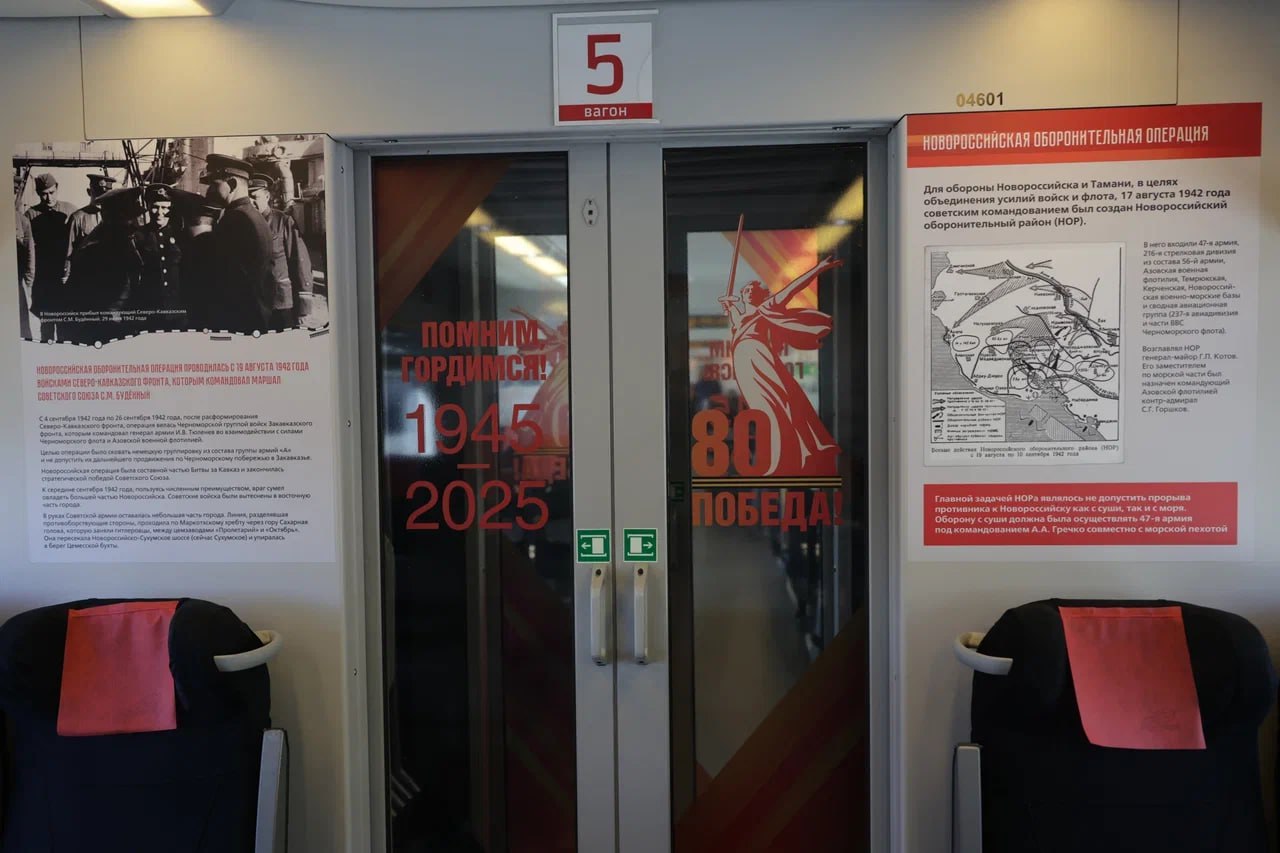 Ростовская область, 30 апреля 2025. DON24.RU. Между Ростовом-на-Дону и Новороссийском начала курсировать брендированная к 80-летию Победы «Ласточка» «Малая Земля». Об этом сообщила пресс-служба СКЖД.